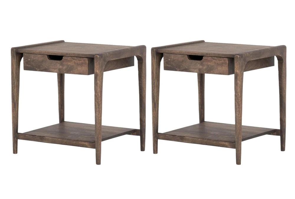 The Valery 1 Drawer Nightstand Set of 2 is a mid-century modern styled storage solution made from solid mango wood in an aged brown color. With convenient drawers, this set is the perfect addition to any bedroom.