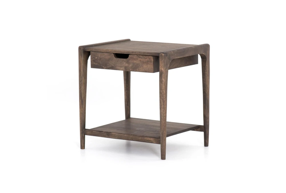 The Valery Nightstand is a mid-century modern style nightstand made of solid mango wood in an aged brown finish. It comes fully assembled and features drawers for convenient storage in your bedroom.