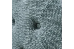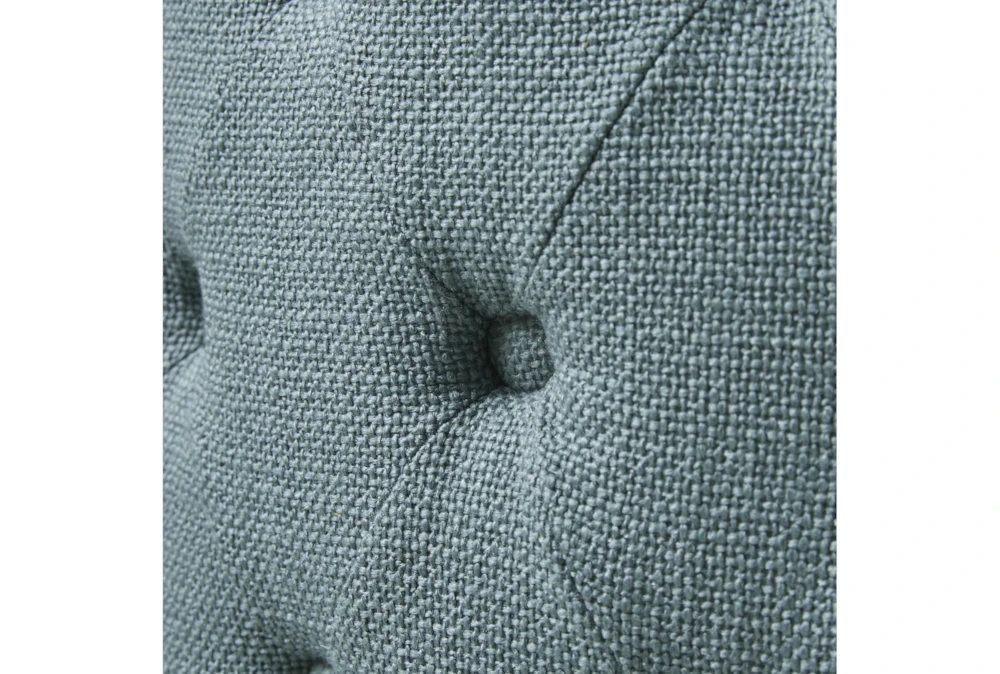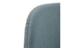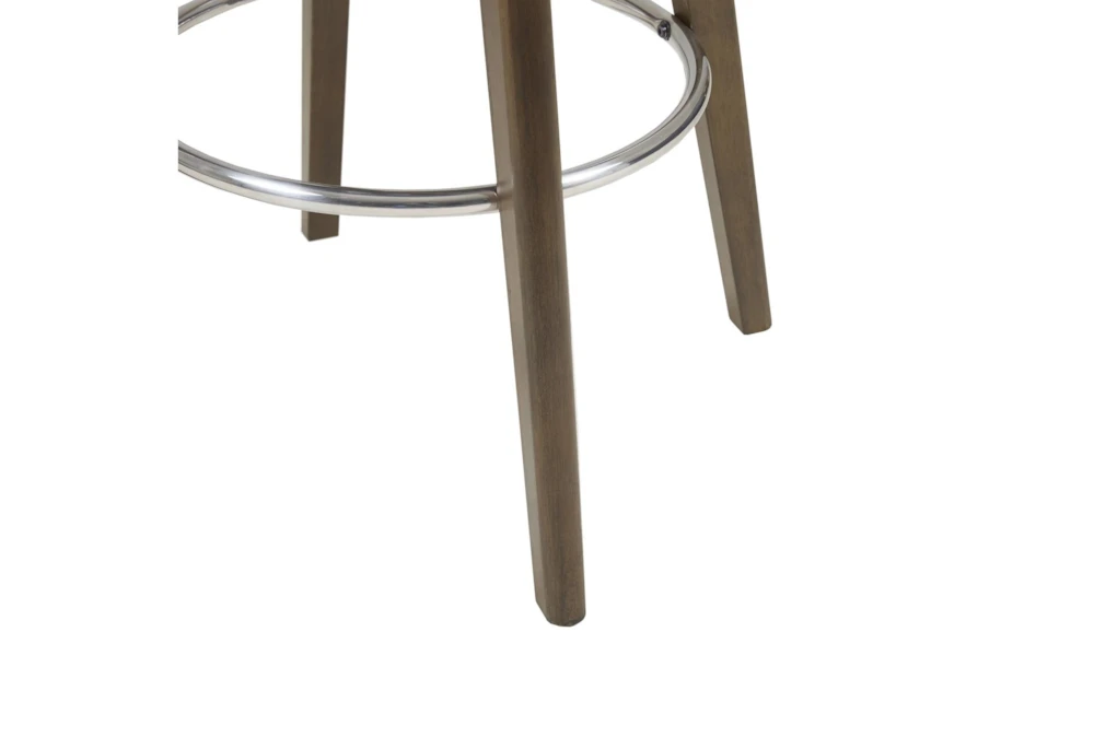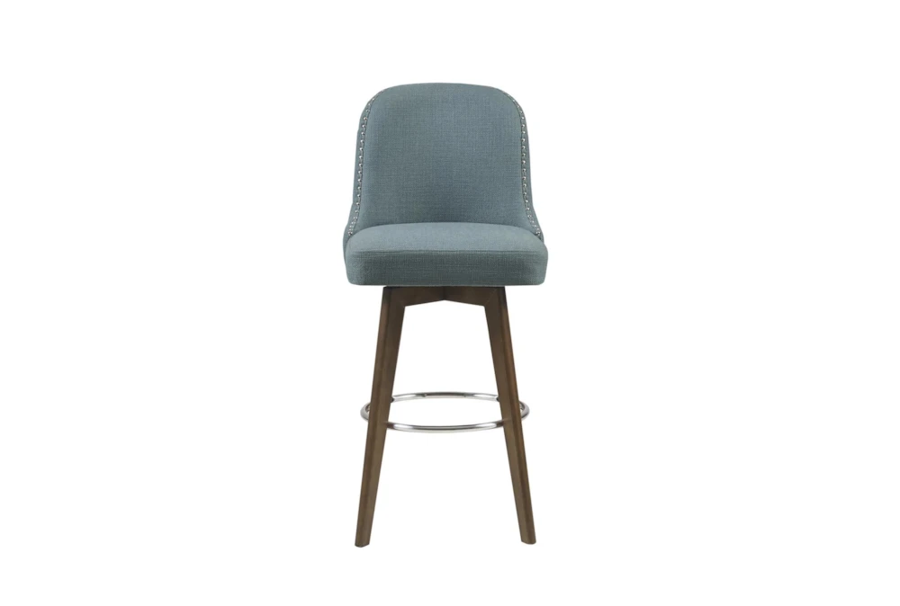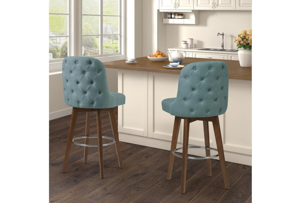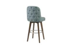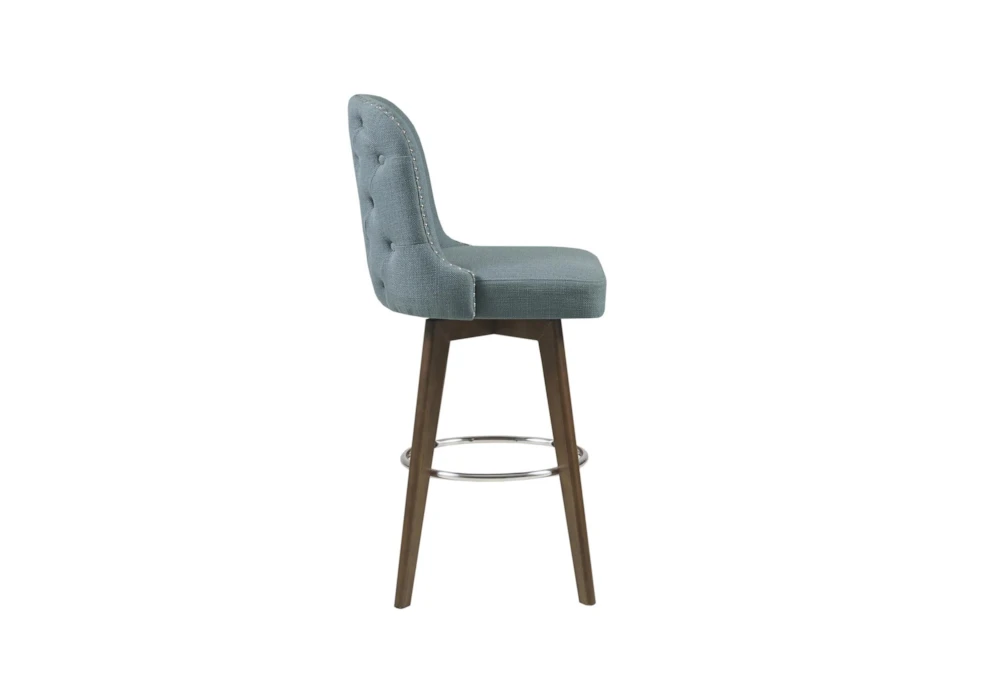 The Wheatley Blue Bar Stool with Swivel Seat is a casual addition to any dining room, featuring a tufted foam cushion and armless design with a back and nailhead accents. The stool is constructed with solid wood and plywood, a medium walnut finish, a polished silver metal footrest, and upholstered in a polyester and acrylic blend fabric. Assembly is required.