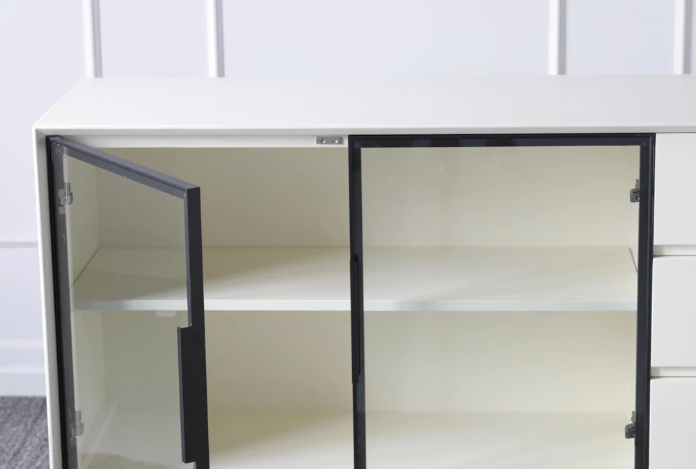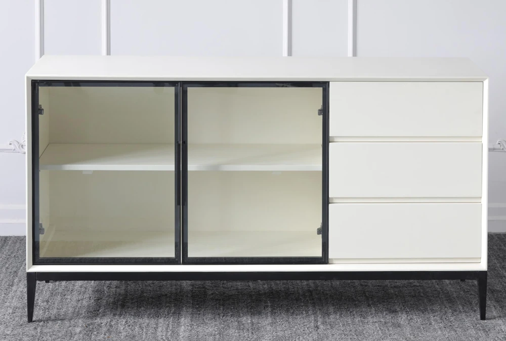 This modern White 3 Drawer 2 Door Sideboard is crafted from wood and features glass and metal accents. It offers ample storage, with 3 drawers, shelves, and both solid and glass doors, making it the perfect addition to any contemporary interior.