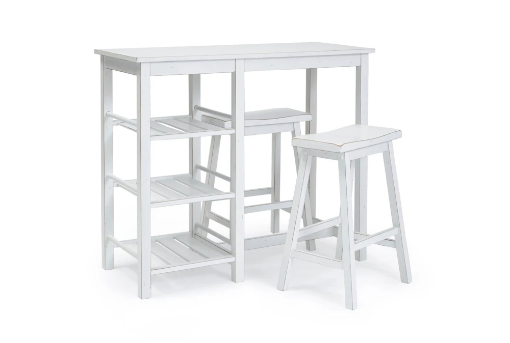 This White Breakfast Table Counter Set For 2 is a casual, tall 3-piece set made of distressed chalk white wood that includes nesting stools and 3 slatted storage shelves for a small scale dining room. Assembly is required for this portable rubberwood and MDF set.
